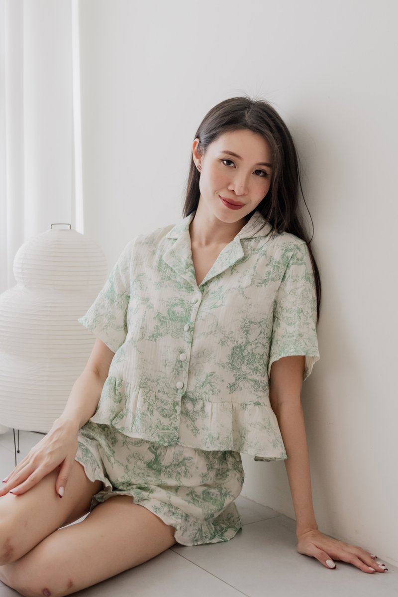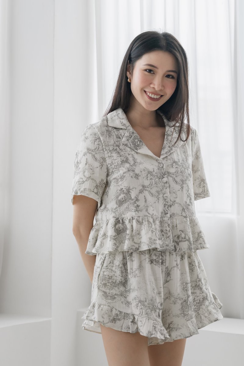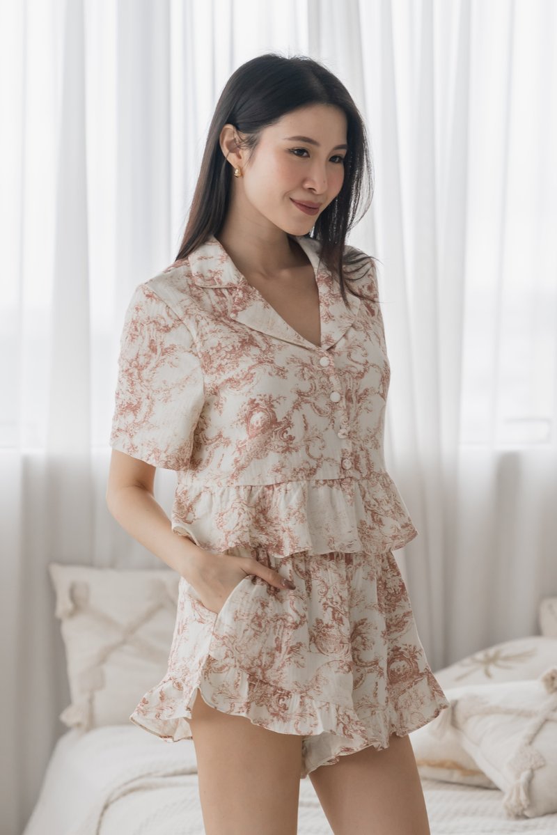 CLAIRE Toile Sleeved 2-Piece Set Sleepwear is a quiet ode to classic charm and everyday comfort. Featuring a timeless toile print with softly structured sleeves, the set pairs a relaxed silhouette with thoughtful detailing for effortless elegance. Light, breathable, and gently tailored, it’s designed for slow mornings, unhurried nights, and everything in between.
